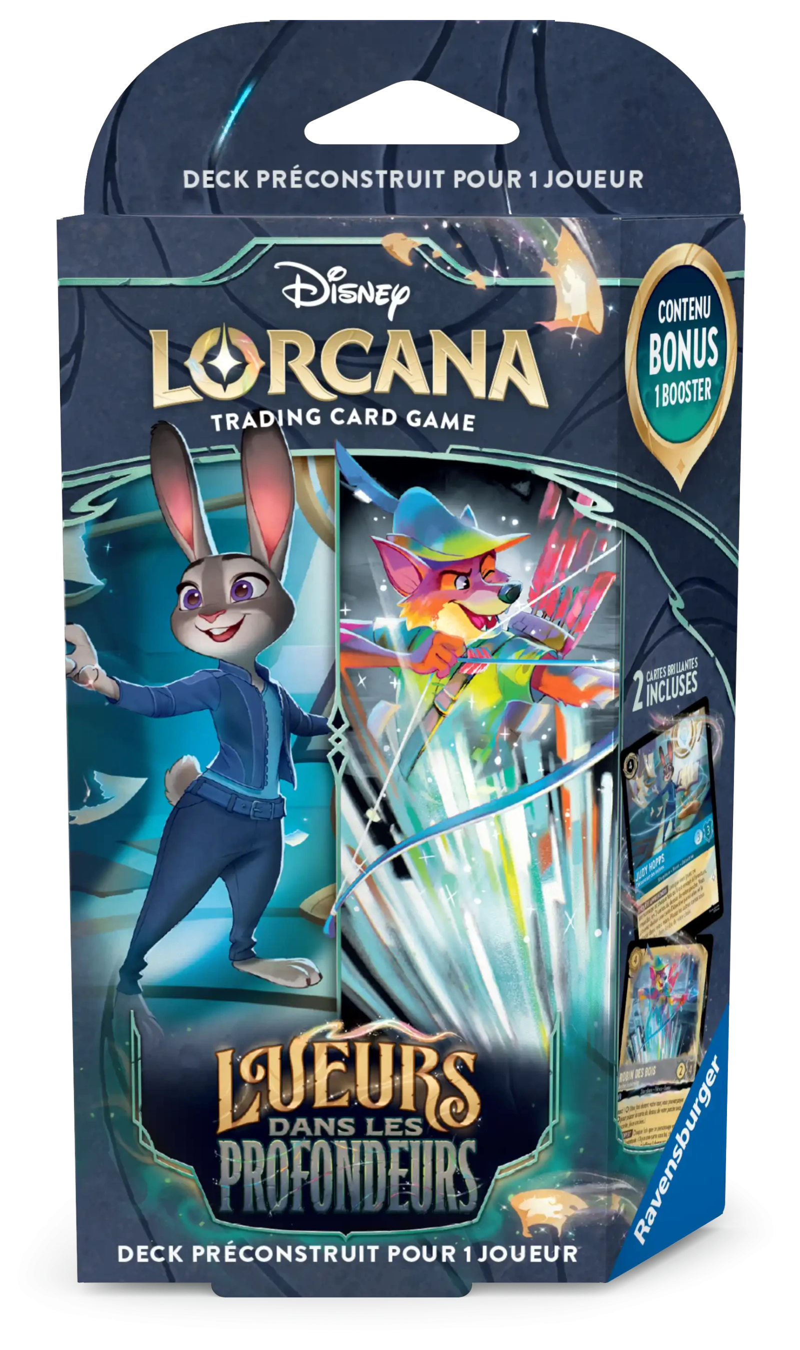 Les decks préconstruits pour 1 joueur Disney Lorcana TCG ont tout le matériel nécessaires pour jouer contre un autre joueur avec son propre deck. Grâce à ces decks, vous découvrirez l'histoire riche et les personnages variés de Disney Lorcana. Deux différents decks préconstruits sont disponibles pour Disney Lorcana : Lueurs dans les Profondeurs. Chaque deck contient 60 cartes et propose deux couleurs d'encre avec des styles de jeu distincts. Si vous êtes novice en matière de jeux de cartes à collectionner, ou si vous souhaitez découvrir le jeu avec un deck conçu et testé par l'équipe Disney Lorcana, c'est un bon point de départ.